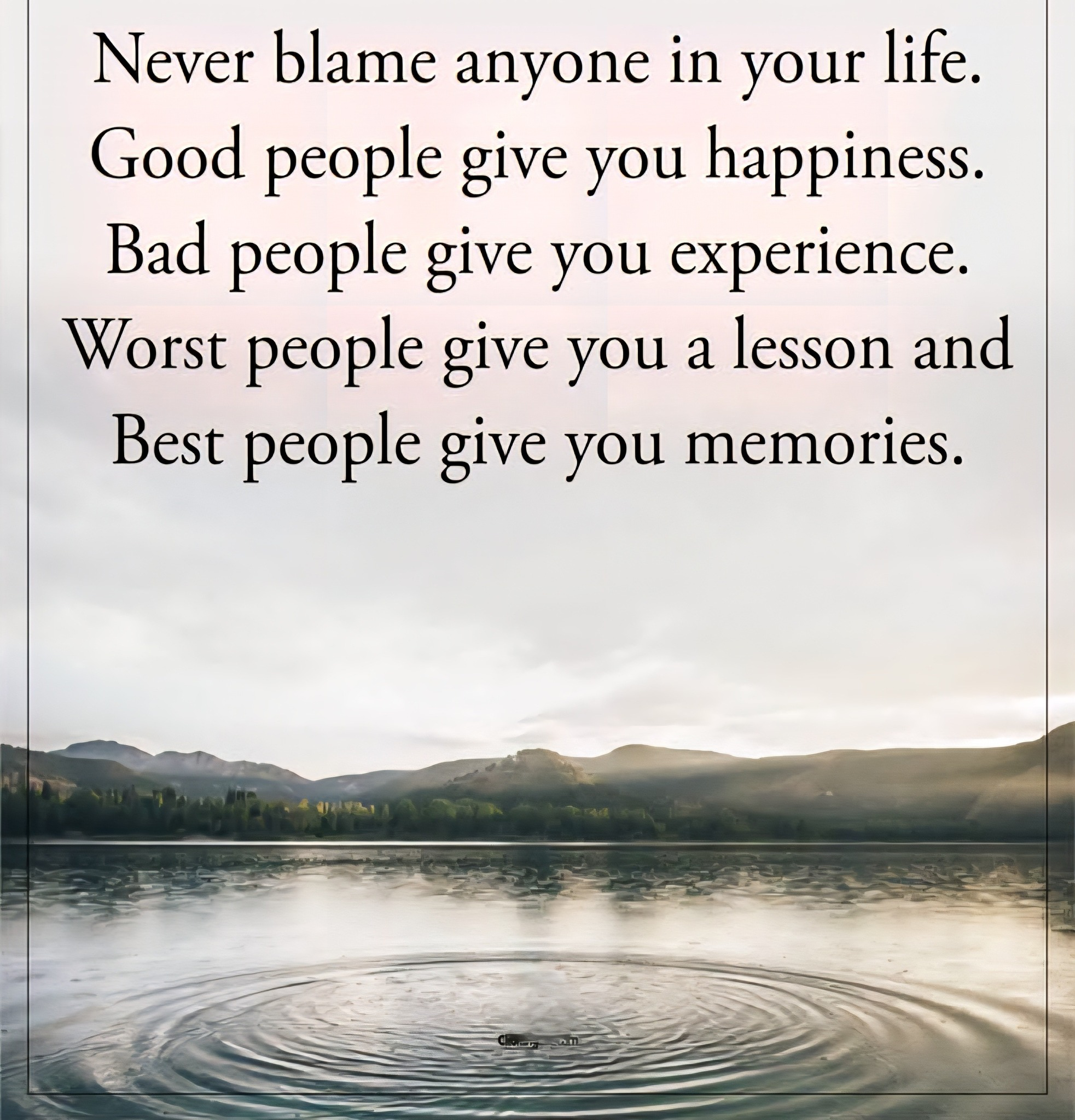 “Never blame anyone in your life. Good people give you happiness. Bad people give you experience. Worst people give you a lesson, and the best people give you memories.”